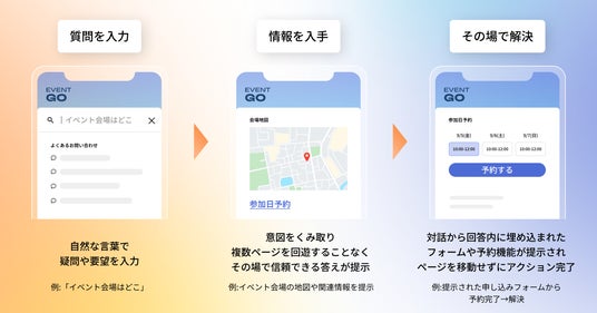 「答え」を見つけたその場で「解決のためのアクション」まで実行できるため、分断されがちな自己解決体験を一つにつなげます。回答の本文内にフォームやオンラインストア、地図といった業務特化型アプリを直接埋め込むことで、顧客はHelpfeelを離れることなく、たとえば「イベント情報の検索~詳細確認~来場予約」までを1画面でスムーズに完結できます。