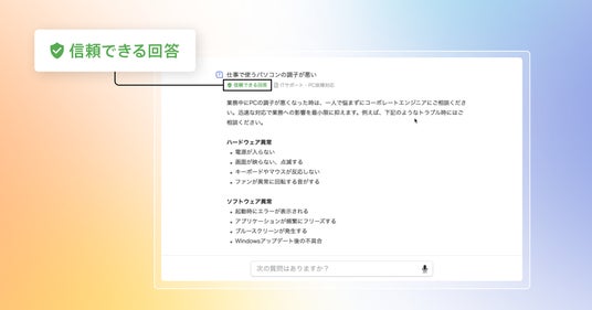 「Helpfeel Agent Mode」は、確かな根拠をもつ情報には「信頼できる回答」のアイコンを表示します。顧客は回答の確かさをひと目で把握でき、安心して解決のためのアクションに進むことができます。これにより解決につながる過程からの離脱を防ぎ、顧客接点の価値を高めながら、収益機会を創出します。