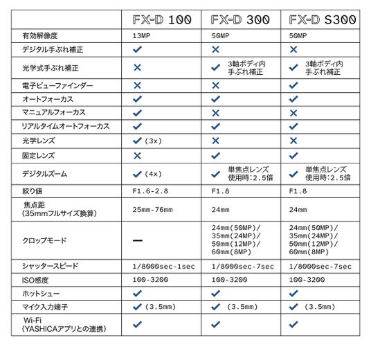 - YASHICA FX-D S300:FX-D 300の機能に加え、EVF(電子ビューファインダー)を搭載。没入感ある撮影体験を実現。精悍なオールブラック仕様。