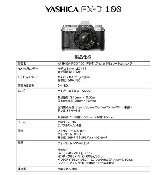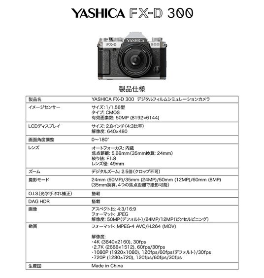 - YASHICA FX-D 300:5000万画素センサー搭載、3軸光学手ブレ補正。シルバー天板とブラックボディのツートーン仕様。