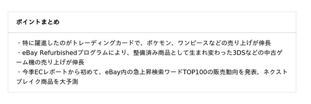 世界最大規模のオンライン・マーケットプレイス「eBay(イーベイ)」は今年設立30周年を迎えます。16年以上eBayにおける日本セラーの越境EC(海外販売)を支援するイーベイ・ジャパン株式会社(所在地︓東京都渋谷区、代表取締役社長︓岡田 雅之、以下イーベイ・ジャパン)は、2025年(4-6月)の期間において日本セラー(販売者)から出品されたアイテムの販売動向を発表しました。