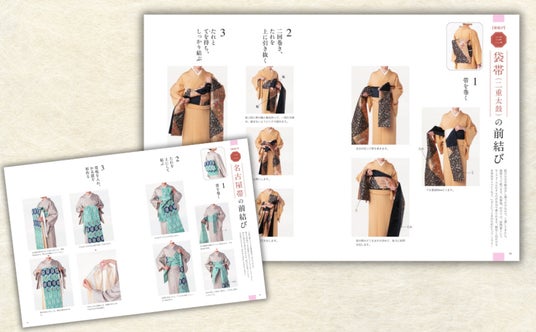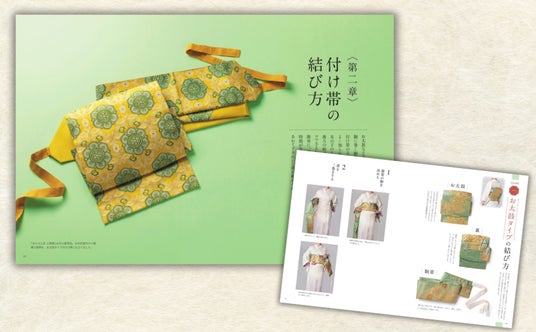 第1章「前結び」では、半幅帯(文庫結び)、名古屋帯(一重太鼓)、袋帯(二重太鼓)のごく基本的な3種類をご紹介。難しいきもの用語をできるだけ使わず、シンプルで分かりやすいプロセス解説によって、きもの初心者の方でもすんなりとマスターできる内容になっています。