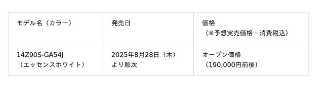 この度新たに発売する「14Z90S-GA54J」は、画面サイズは14インチで、1,120g/16.9mm(重量/薄さ ※突起部除く)の軽量薄型ボディに、エッセンスホワイトのカラーが軽やかさを一層引き立てます。また、72Whのバッテリーを搭載しており、最長14時間(動画再生時)/31時間(アイドル時)の長時間駆動が可能(※1)なほか、厳しい環境下での使用を想定した米国国防総省「MIL-STD-810H」準拠のテストを7項目クリア。(※2)CPUはインテル(R) Core(TM) Ultra 5プロセッサー 125H、ストレージはNVMe(TM) 512GB SSD、メモリは16GBを搭載しており、ビジネスシーンでのマルチタスクも快適に行えます。ディスプレイは高解像度WUXGA(1920x1200)でIPSパネルを採用しているほか、広色域なデジタルシネマ規格DCI-P3を99%カバーしているため、豊かな色彩でコンテンツを表示できます。このように、パワフルな性能を軽快に持ち出すことができ、好きな場所で好きなことに没頭するためのパートナーとして活躍する1台です。