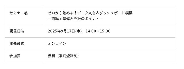 株式会社メディックス(本社:東京都千代田区、代表取締役:田中正則、以下メディックス)は、Webマーケティングの担当者様・事業責任者様向けに、無料オンラインセミナー『ゼロから始める!データ統合&ダッシュボード構築 ―前編:準備と設計のポイント―』を開催いたします。