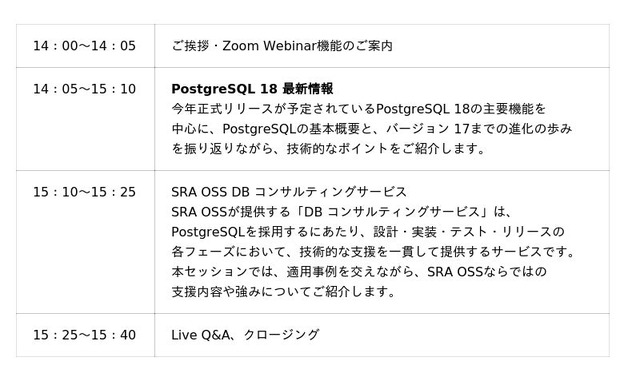 PostgreSQLに精通したエンジニア達が皆様からのご質問にリアルタイムでお答えすることで、録画配信とは異なるインタラクティブな体験を提供します。