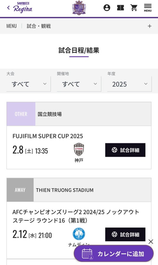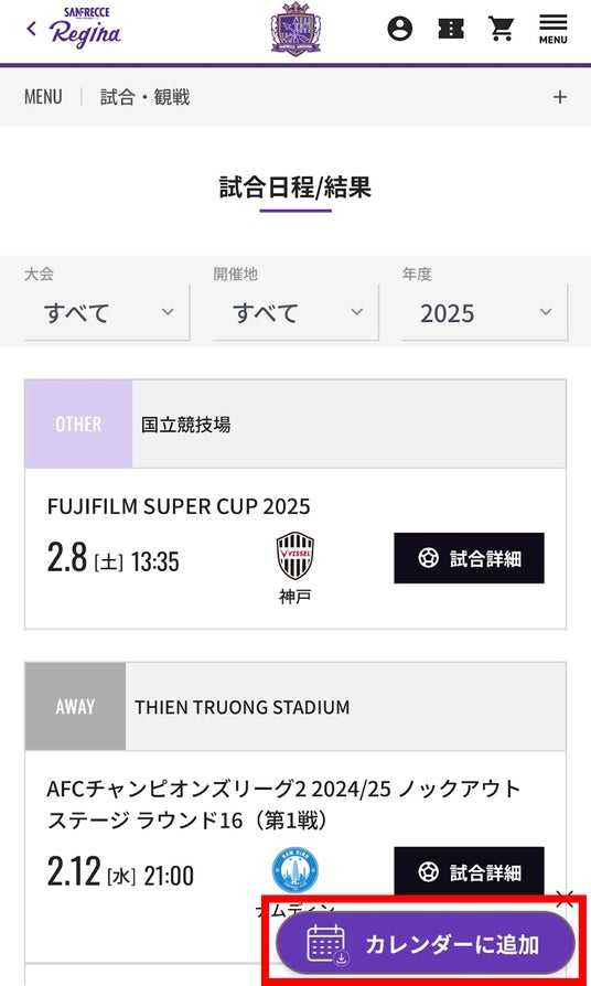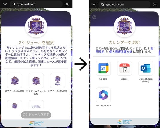 本日より、当クラブおよび女子チーム サンフレッチェ広島レジーナ の試合日程や関連情報を、皆さまのGoogle/Apple/Outlook等のデジタルカレンダーへワンクリックで同期できる新機能の提供を開始します。