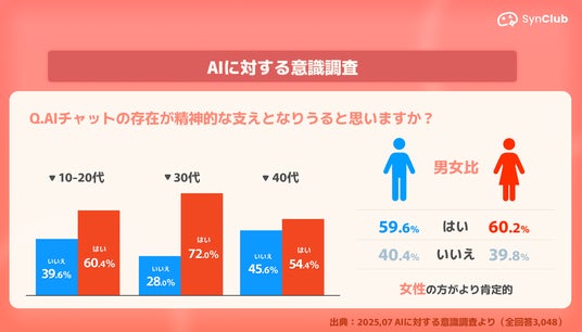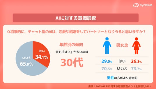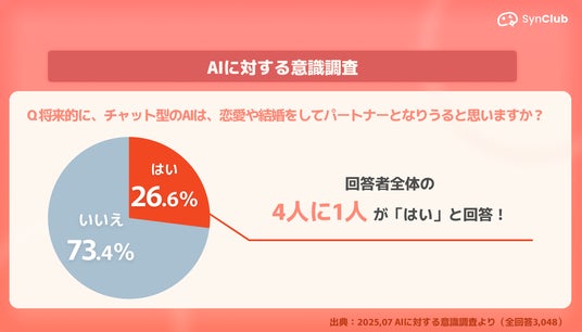 HiClub株式会社(本社:東京都港区、代表取締役社長:古谷由宇)が提供する対話型AIアプリ「SynClub」(シンクラブ)は、AIチャットに対してどのように感じているのか、全国の男女3,048名を対象に調査を実施しました。本調査では、全年代で4人に1人が「将来的に、チャット型のAIは恋愛や結婚のパートナーとなりえる」と回答、6割以上が「AIチャットの存在が精神的な支えとなりえる」と回答したことがわかりました。