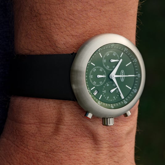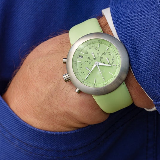 特徴的なくすみ感のある柔らかいピスタチオグリーンのクロノポッドは、世界限定50本のレアモデル。