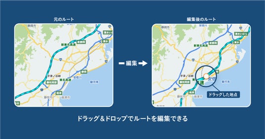 ルートの変化が視覚的にわかりやすいよう、ドラッグ中にルートの変化を確認しながら編集できるようにしています。