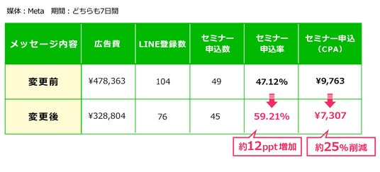 予算消化は減ったが効率が改善し、申込率・CPAとも大幅向上。広告とLINE配信を統一することでユーザーがスムーズに申し込め、設定も一度で完結し作業工数を削減できました。