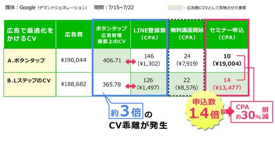 しかし、A(LPボタンタップ最適化)とB(LINE登録最適化)を比較すると、Bパターンはセミナー申込数が1.4倍に増加し、CPAも30%削減。