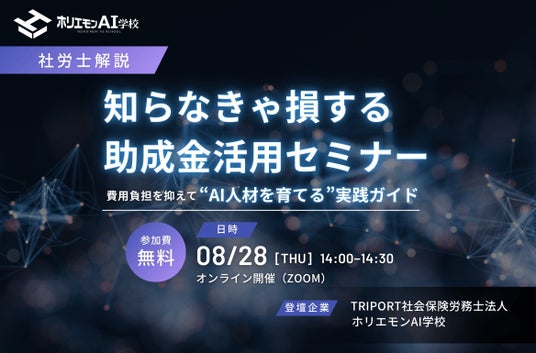 TRIPORT社会保険労務士法人(代表社員:岡本 秀興、以下TRIPORT)は、AI人材育成スクールを運営するホリエモンAI学校株式会社(代表取締役CEO:荒木 賢二郎)が主催するセミナーにおいて、2025年8月28日(木)14時より、『知らなきゃ損する助成金活用セミナー~費用負担を抑えて“AI人材を育てる“実践ガイド~』に登壇することをお知らせいたします。