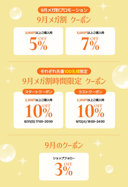 メガ割20%OFFクーポンと併合して使用できる、最大10%OFFショップクーポンから、ビタミンたっぷりオマケまで!この期間を機会にぜひお試しください。