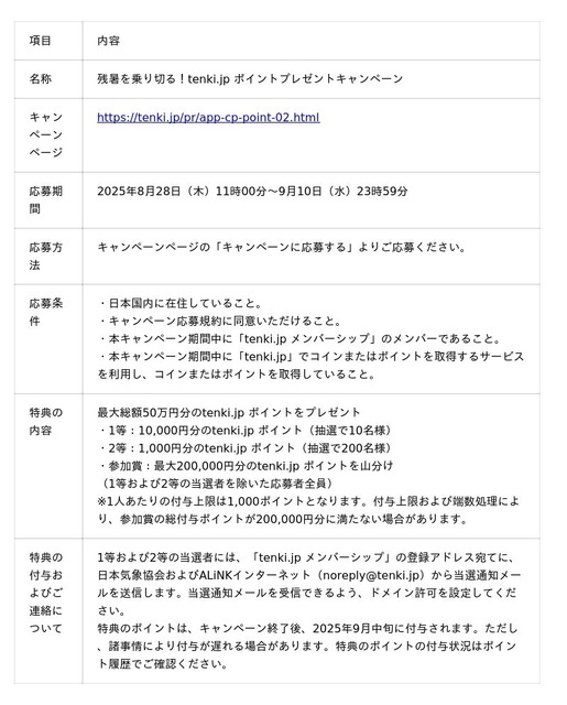 ◆残暑を乗り切る!tenki.jp ポイントプレゼントキャンペーンについて
