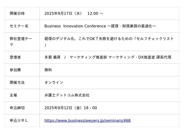 この度、株式会社インボイス(代表取締役社長:加茂 正巳 本社:東京都千代田区)は 2025 年9月17日(水)に開催される、 弁護士ドットコム株式会社(代表取締役社長:元榮 太一郎 本社:東京都港区)主催の「Business Innovation Conference ~経理・財務業務の最適化~」へ登壇いたします。