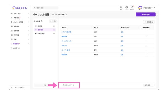 従来の「エルグラム」では、データを削除すると即時反映され復旧ができませんでした。しかし、今回のアップデートにより、削除されたデータは「削除済みデータ」として90日間保管されるようになりました。