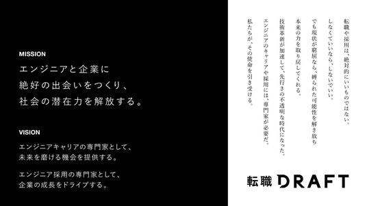 変化の激しい時代において、エンジニアのキャリアは先行きが不透明になりがちです。転職ドラフトは、それぞれのエンジニアが目指す未来に近づけるよう、自分らしくキャリアを磨ける機会を提供します。また、採用においては単に採用数を増やすだけでなく、人材が定着し、活躍することで企業の成長を牽引することを重視し、その専門家としての役割を担います。