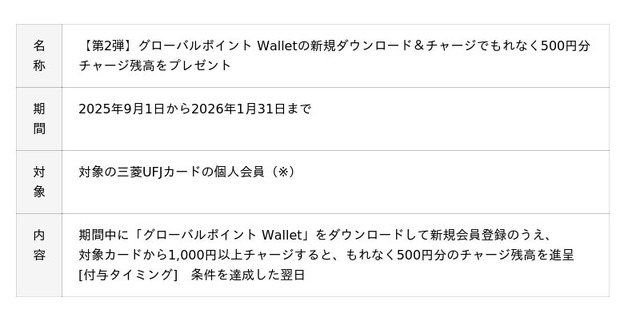 三菱UFJニコスは2025年9月1日から2026年1月31日まで、モバイル決済アプリ「グローバルポイント Wallet」をダウンロードし新規会員登録のうえ、対象の三菱UFJカードから1,000円以上をチャージされた方に500円分、さらに2025年9月30日までに「グローバルポイント Wallet」にてQUICPay+を合計2,000円以上利用された方に1,000円分のチャージ残高をもれなく進呈する、2つのキャンペーンを実施します。