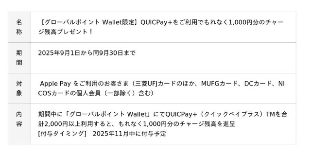 【グローバルポイント Wallet限定】QUICPay+をご利用でもれなく