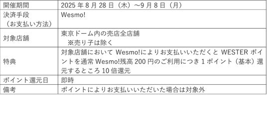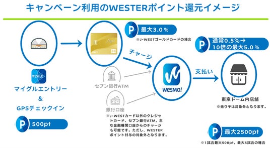Wesmo!にチャージして東京ドームにおいてチェックイン&Wesmo!にチャージ・対象店舗でのWesmo!ご利用によりWESTERポイント(期間・用途限定)最大1,000pt還元
