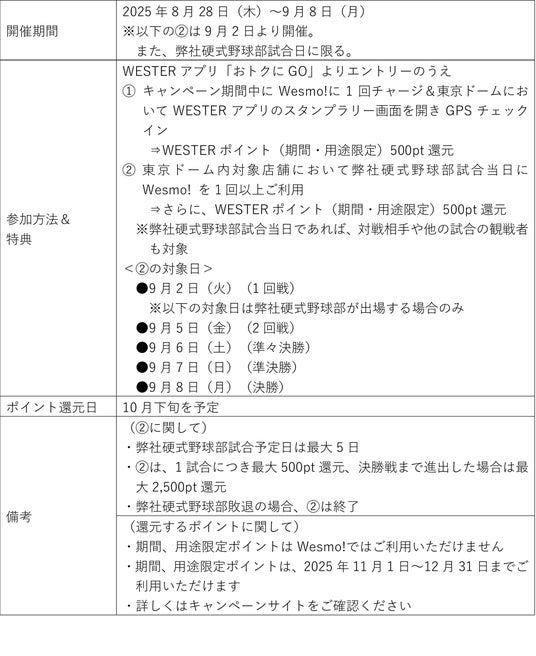 西日本旅客鉄道株式会社(本社:大阪府大阪市、代表取締役社長:倉坂昇治)は、JR西日本のスマホ決済アプリ『Wesmo!』のキャンペーンとして、第96回都市対抗野球大会が開催される2025年8月28日(木)~9月8日(月)までの間、1.東京ドーム内の対象店舗においてWesmo!をご利用いただくとWESTERポイント(基本)10倍、2.東京ドームにおいてチェックイン&Wesmo!にチャージ・対象店舗でのWesmo!ご利用によりWESTERポイント(期間・用途限定)を最大1,000pt還元する『Wesmo!都市対抗野球応援キャンペーン』を開催します。