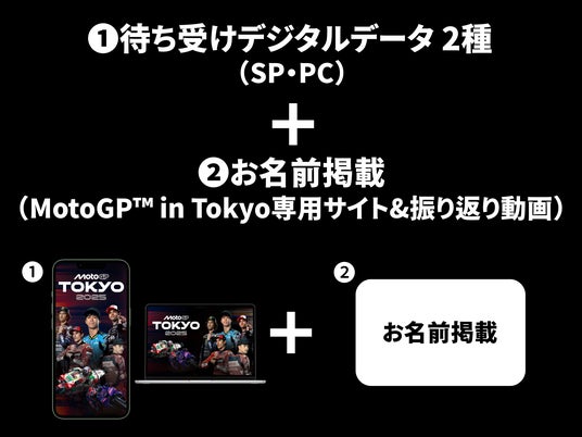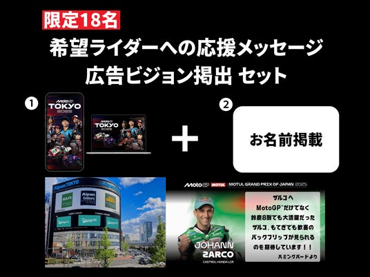 今回のクラファンは、1,000円から気軽に参加可能。支援額に応じて、デジタル特典から掲出体験まで、さまざまなリターンをご用意しました。応援メッセージは、「MotoGP(TM) in Tokyo」会場ビジョンと新宿ユニカビジョンに掲出され、推しライダーへの想いを街全体に届けることができます。