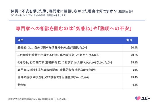 専門家への相談をためらう背景には、「この程度の症状で相談するのは気が引ける」(29.2%)といった気兼ねや、「自分の症状をうまく説明できる自信がなかった」(13.4%)というコミュニケーションへの不安が存在することも浮き彫りになりました。
