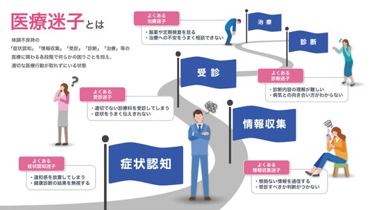 「医療迷子」とは、体調不良時の「症状認知」「情報収集」「受診」「診断」「治療」等の医療に関わる各段階で何らかの困りごとを抱え、適切な医療行動が取れずにいる状態を指す、Ubieが提唱する概念です。
