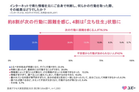 インターネットで情報収集をした後、次にとるべき対処法について、「明確になり、すぐに行動できた」と回答した人は23.5%にとどまり、残りの約8割(76.5%)は判断に迷ったり、情報過多で疲弊したりと、次の行動に移る際に何らかの困難を抱えていることがわかりました。特に、情報源の不一致や内容の専門性、情報量の多さや不安感から、最終的に行動を決められずに止まってしまう「立ち往生」状態に陥るケースが42%見られました。