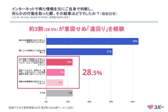 得た情報を元に行動した結果、延べ約3割(28.5%)が、専門外の医療機関を受診してしまったり、自己判断で試した市販薬で症状が長引いたり、複数の医療機関を受診することになったなど、結果的に最適な医療から遠回りしてしまった経験があることが明らかになりました。