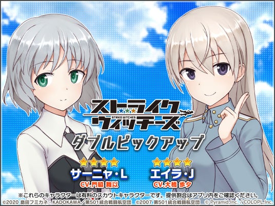 同じくプレイアブルキャラとなった「サーニャ・V・リトヴャク(CV:門脇 舞以)」と「エイラ・イルマタル・ユーティライネン(CV:大橋 歩夕)」の、★4キャラをピックアップした「ダブルピックアップスカウト」も開催しております。