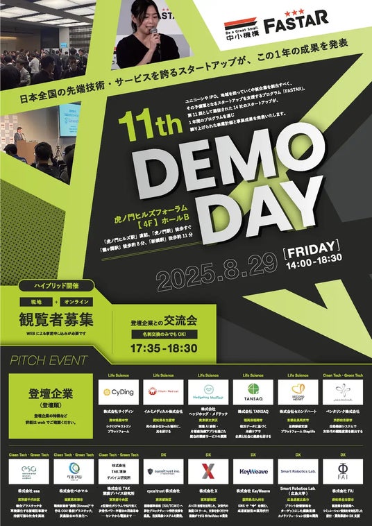(出典:中小機構「スタートアップの資金調達や事業提携のマッチング機会を提供するFASTARピッチイベント「FASTAR 11th Demo Day」8月29日開催」https://prtimes.jp/main/html/rd/p/000001755.000021609.html)