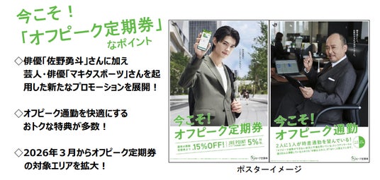 ○昨年より起用の俳優「佐野勇斗」さんに加え、新たに芸人・俳優「マキタスポーツ」さんを起用し、「今こそ!オフピーク定期券」「今こそ!オフピーク通勤」をキャッチコピーとした新たなプロモーションを行います。
