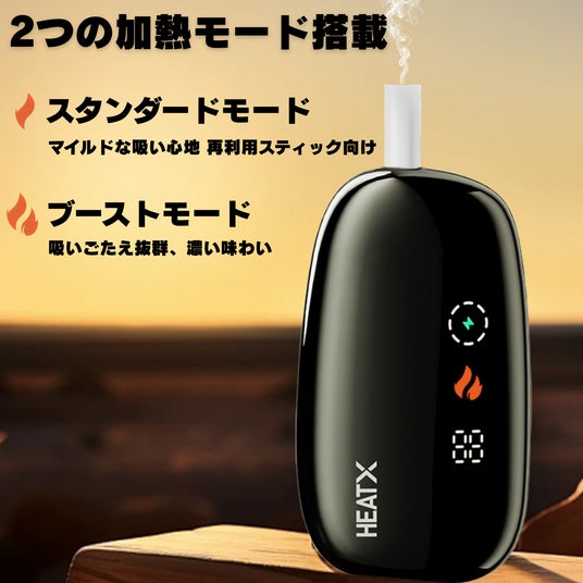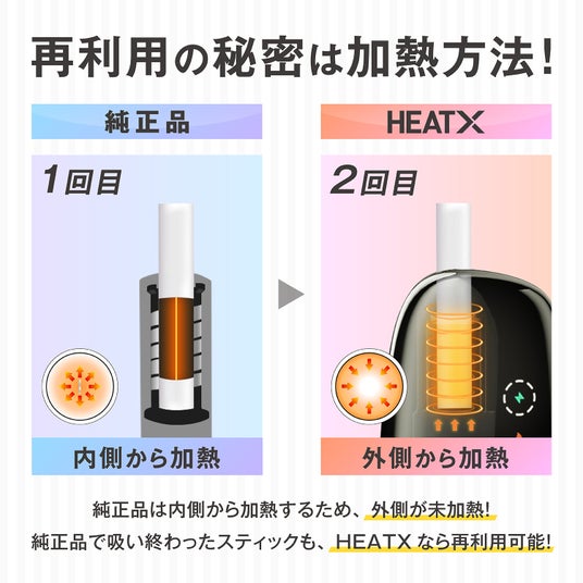 「HEATX」は、1本のたばこスティックで2回吸え、たばこ代を約半分に抑えられる画期的な加熱式たばこデバイスです。他社のデバイス(アイコスイルマなど)で1回目の喫煙後、同じスティックを本デバイスにセットすれば、2回目の喫煙が可能になり、たばこ代が自質半額になります。