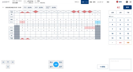 4mm以上の歯周ポケットの深さといった主要指標は自動で計算できるため、計測や集計の手間を減らします。さらに、クリニカルアタッチメントレベル(CAL)や根分岐部病変、コンタクトなど専門的な検査項目も充実しており、一般歯科から歯周病専門クリニックまで幅広く対応可能です。これにより、従来の歯周病検査で大きな負担となっていた作業を大幅に軽減し、検査を最大限に効率化します。