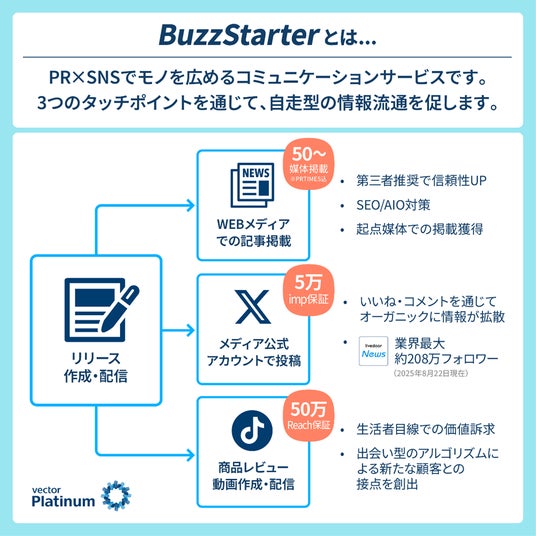 株式会社プラチナム(本社:東京都港区、代表取締役:吉柳 さおり)は、SNSでモノが売れる時代の新ソリューションとして、PRとSNSを掛け合わせて話題化の起点をつくる「BuzzStarter(バズスターター)」の提供を開始します。本サービスは、PR視点での文脈設計を基盤に、WEBメディア・X・TikTok動画の3つのタッチポイントで情報を発信。情報の自走を促すコンテンツ設計と、メディア掲載数・SNSリーチ保証を組み合わせた新ソリューションです。