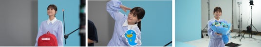 「なまベェ」との共演ということで、ブルーバックのスタジオにて撮影に臨んだ芳根さん。打ち合わせの真剣な表情から一変、軽快な演技が続く撮影中は常に笑顔全開で、終始明るい現場となりました。「なまベェ」の第一印象について、「青い…魚…かわいい!」と笑いながら話す芳根さんは、「なまベェ」との掛け合いもばっちり。