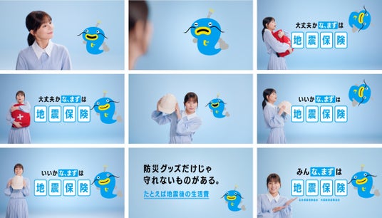 新CMは、日本で古くから「地震を予知する」と伝承されてきた「なまず」をモチーフとしたキャラクター「なまベェ」との軽快な掛け合いが特徴です。地震への備えとして「防災リュック」や「ヘルメット」を挙げる芳根さんに、「だけで、大丈夫か?」となまベェが問いかけることで、防災グッズだけでは被災後の生活までは守れないことに気づかされる内容となっています。最後は、もしもの災害への備えとして地震保険を想起していただけるよう、なまずとの語呂合わせによる「みんな、まずは地震保険。」という印象的なフレーズで強調します。