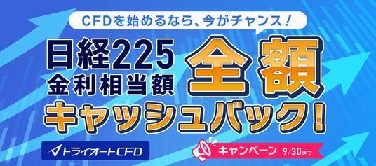 インヴァスト証券株式会社(本社:東京都港区、代表取締役社長:伊藤 誠規)は、店頭CFD取引サービス「トライオートCFD」において、2025/8/28(木)~2025/09/30(火)にて、「日経225金利相当額キャッシュバックキャンペーン」を開催いたします!