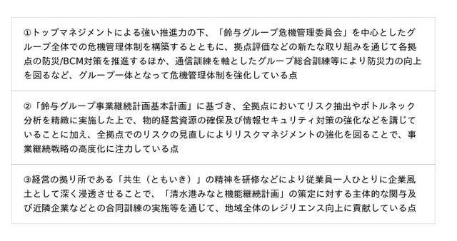 鈴与株式会社(本社:静岡市、代表取締役社長:鈴木 健一郎)は、株式会社日本政策投資銀行(本社:東京都千代田区、代表取締役社長:地下 誠二、以下「DBJ」)が実施する「DBJ BCM格付」融資※制度において、「防災及び事業継続への取り組みが特に優れている」という最高ランクの評価を取得しました。当社の「DBJ BCM格付」最高ランク取得は、6回連続となります。