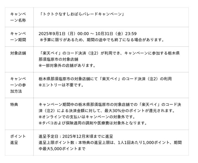 本キャンペーンでは、栃木県那須塩原市の対象店舗(注1)において、キャンペーン期間中に「楽天ペイ」のコード決済(注2)を利用すると、決済金額に対して最大30%分の「楽天ポイント」が還元(注3)されます。