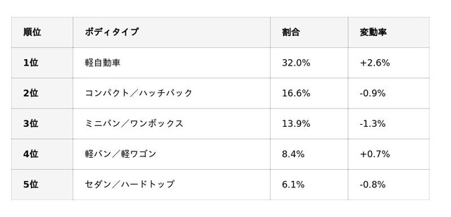 国産車のボディタイプ別ランキングでは、軽自動車が変わらず1位を維持しています。7月は軽自動車に属するボディタイプがシェアを伸ばしている一方で、その他ボディタイプがシェアを落としています。