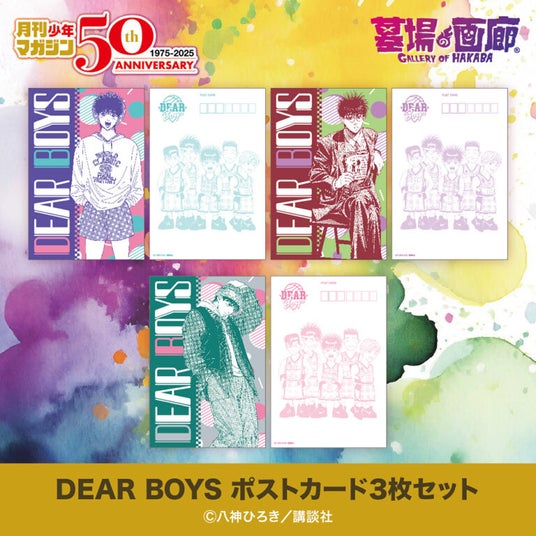 リアルなバスケ描写と青春の輝きを詰め込んだ『DEAR BOYS』から、オフショットを中心にイラストを選定したポストカード3枚セットが登場!平成レトロ感あふれる懐かしい雰囲気のデザインに、バスケットボールシーン以外の普段着カットと、デフォルメされたメンバーたちがかわいい3種セットだ!