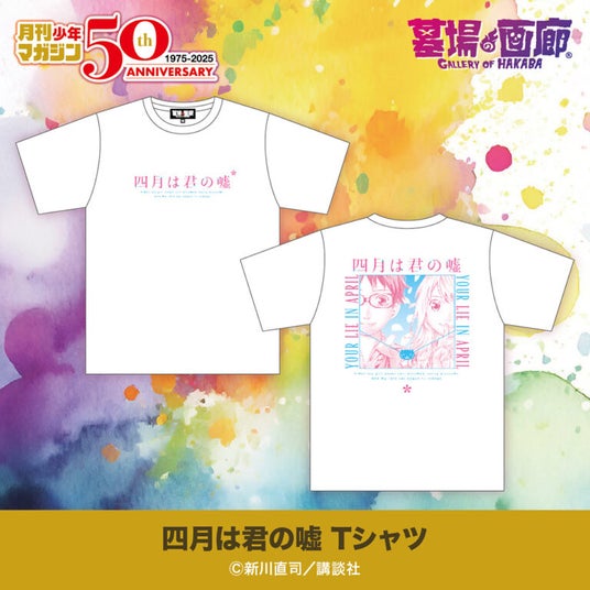 主人公・有馬公生と宮園かをりの二人がプリントされた公式Tシャツが登場!タイトルを想起させる鮮やかな春色のカラーリングにくわえ、物語のキーとなる黒猫チェルシーがかわいらしく配置されたドラマティックなデザインです。