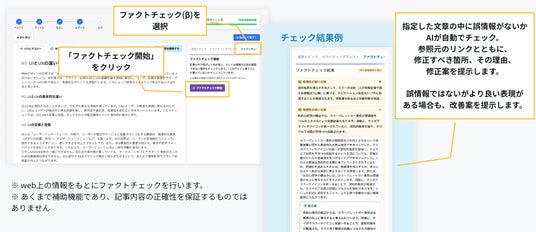 ファクトチェック機能(β)は、かんたんAI記事生成機能で生成された記事を、AIがWeb検索上の情報と照合し、「改善が必要な箇所」「改善が必要な理由」「書き換え後のテキストの提案」を出力する機能になります。