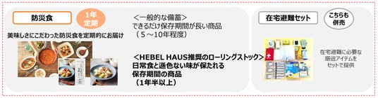 防災備蓄に必要な防災食・防災グッズ(在宅避難セット)などを HEBELIAN NET.の EC サイトで簡単に購入できます。当社が提供するセレクト防災食は、日常食と遜色ない味が保たれる保存期間1年半以上の商品を取り扱い、防災食の「備蓄と消費」のサイクルを早めることで、防災食のローリングストックを目指します。また、災害対策として関心が高まっている太陽光発電および蓄電池の設置についても、旭化成リフォームに相談が可能です。これらを行うことで、防災意識の希薄化の防止、災害時の実践力の向上、美味しい防災食の利用、家族の防災コミュニケーション機会の創出などにつなげていきます。