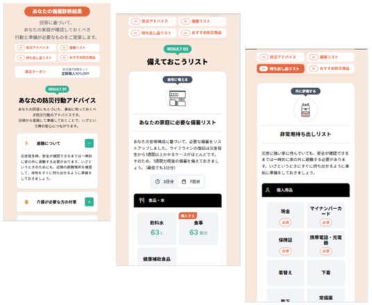 本サービスは、家族構成や生活習慣などの情報に基づいた防災診断機能を中心に、防災備蓄品のEC購入、定期的な通知・再診断を組み合わせたワンストップ型の支援サービスです。診断結果に応じて、各家庭に必要な備蓄品や防災行動アドバイスを個別に提案し、さらにローリングストックができる防災食の定期購入で、継続的な備えをサポートします。