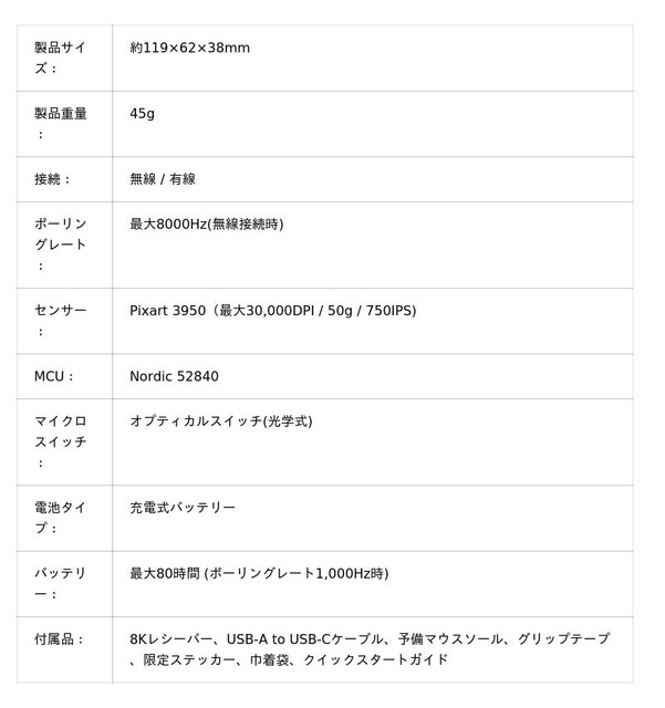 プロゲーマーの厳しい要求に応えるべく、わずか45gという驚異的な軽さを実現。長時間の激しいゲームプレイでも手首への負担を極限まで軽減し、まるで翼を得たかのような自由自在なマウス操作を可能にします。