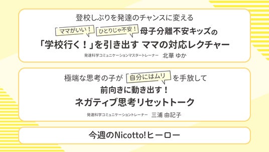 この時期にどのような対応を取るかが、子どもの“その後”を大きく左右します。そこで今回のNicotto!ライブでは、発達科学コミュニケーションマスタートレーナーの北華ゆか、発達科学コミュニケーショントレーナーの三浦由記子が登壇し、次の2つのテーマを中心に、ママがすぐに実践できる対応をお伝えします。