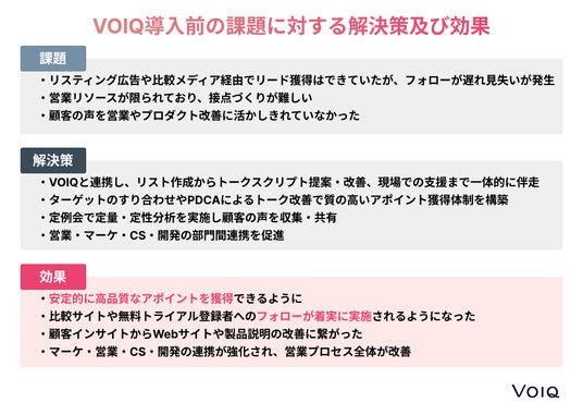 「VOIQさんは、単なるテレアポ代行ではなく、“営業の仕組みそのものを共につくるパートナー”です。顧客の声をもとに、マーケ・営業・CS・開発の各部門が連携して“伝わる仕組み”を構築できたことが、最大の成果だと感じています。」▼事例記事はこちら